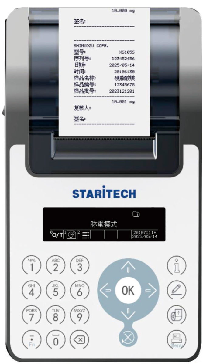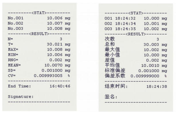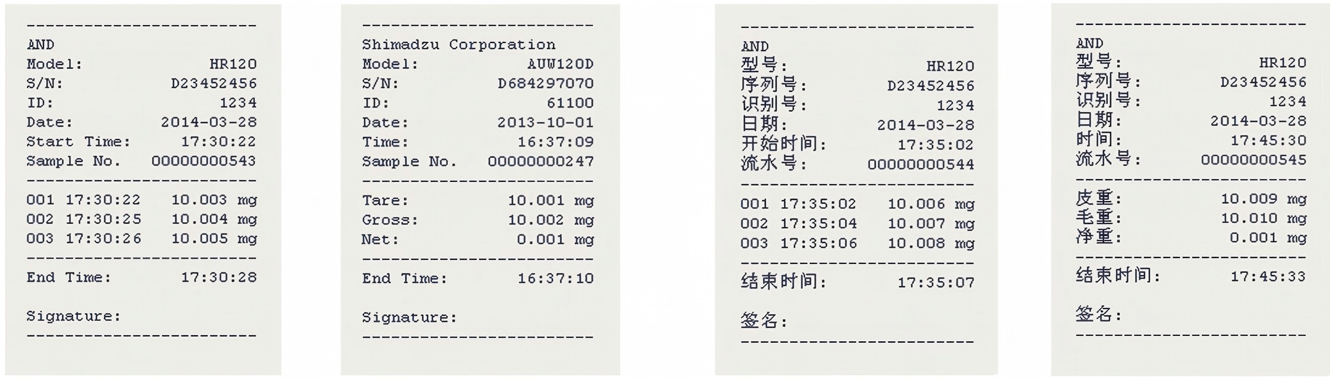 可打印单个或多个称重数据,输出符合法规的报告,也可打印⽪重、⽑重,并⾃动计算/打印净重。在该模式下,称重数据之前将被加⼊报头,称重数据之后加⼊报尾,报头包括:⼚商信息、仪器型号、序列号、样品名称/批号、 ⽇期/时间。流⽔号等,报尾包括:结束时间/⽇期、签名等;报头和报尾的每⼀项均可单独打开或关闭。