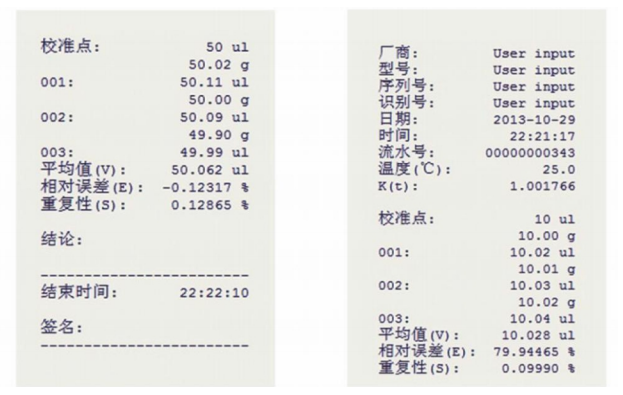 应⽤于移液器、容量瓶等多种体积容器的检定,打印机接收天平传输过来的重量信息 ,以 国标JJG646-2006检定规程为依据,根据当前设定的温 度,⾃动计算Kt值⽤于修正温度对体积的影响,并将重量转换为20度标准温度下的体积值;允许设定多个检定点;⼀个检定点可进⾏多次,求出体积平均值V、相对误差E、重复性S。