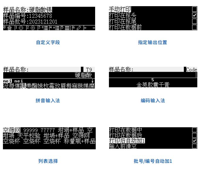⽤⼾可直接使⽤拼⾳输⼊法输⼊样品信息,也可通过 计算机导⼊包含数字代码和⽂字的编码表,使⽤时仅需输⼊数字代码即可输出复杂的⽂字信息,⽅便快捷,此外,TX-181/182/183打印机还⽀持列表直接选择、 数字输⼊、字⺟符号输⼊。